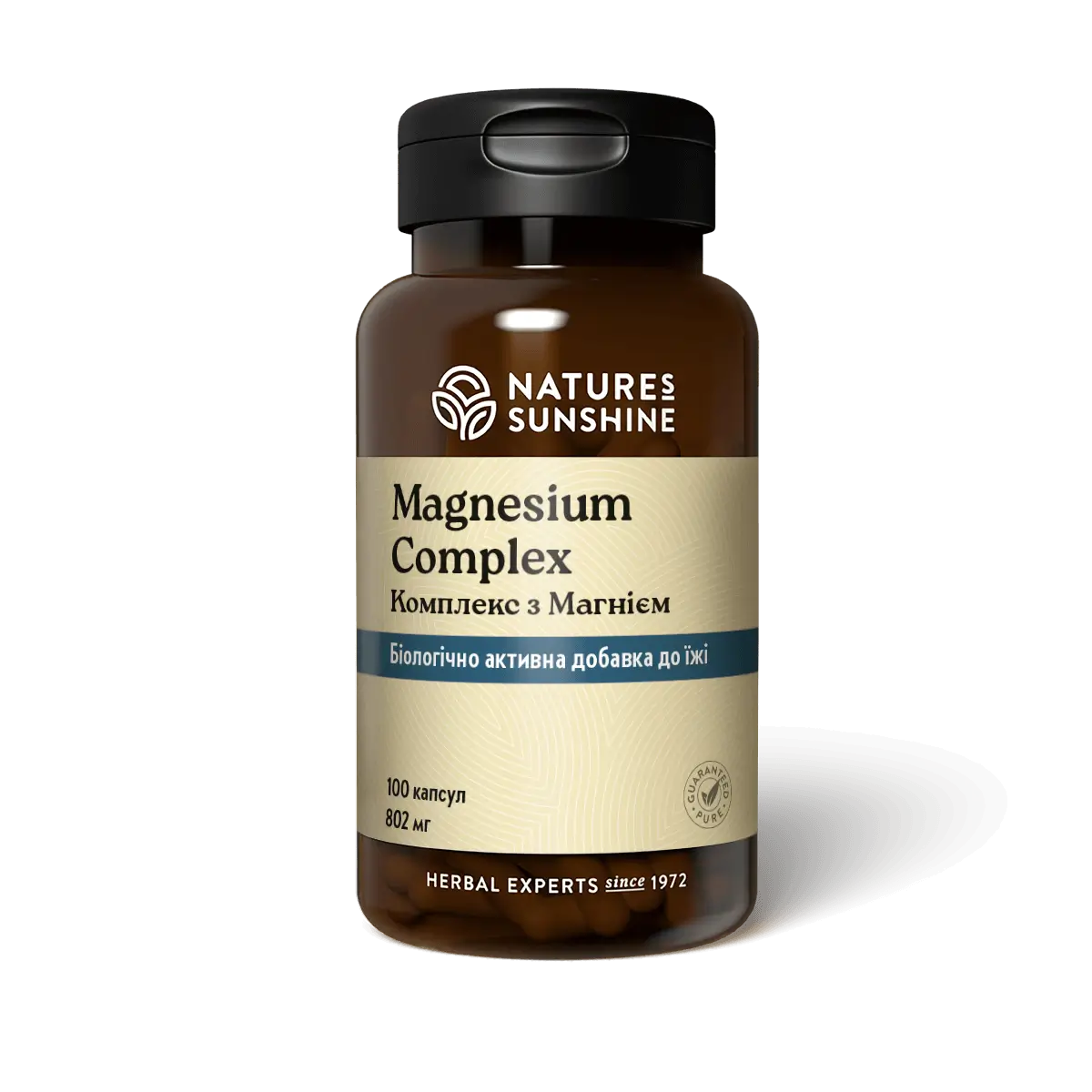 Комплекс з Магнієм є джерелом магнію. Кожна капсула містить 100 мг чистого магнію, що є оптимальною разовою дозою. Магній перебуває в хелатному поєднанні з органічними яблучною та лимонною кислотою, що забезпечує максимальне засвоєння цього макроелемента. Магній у формі цитрату ефективніше знижує ризик кальцифікації судин та утворення каменів у нирках.