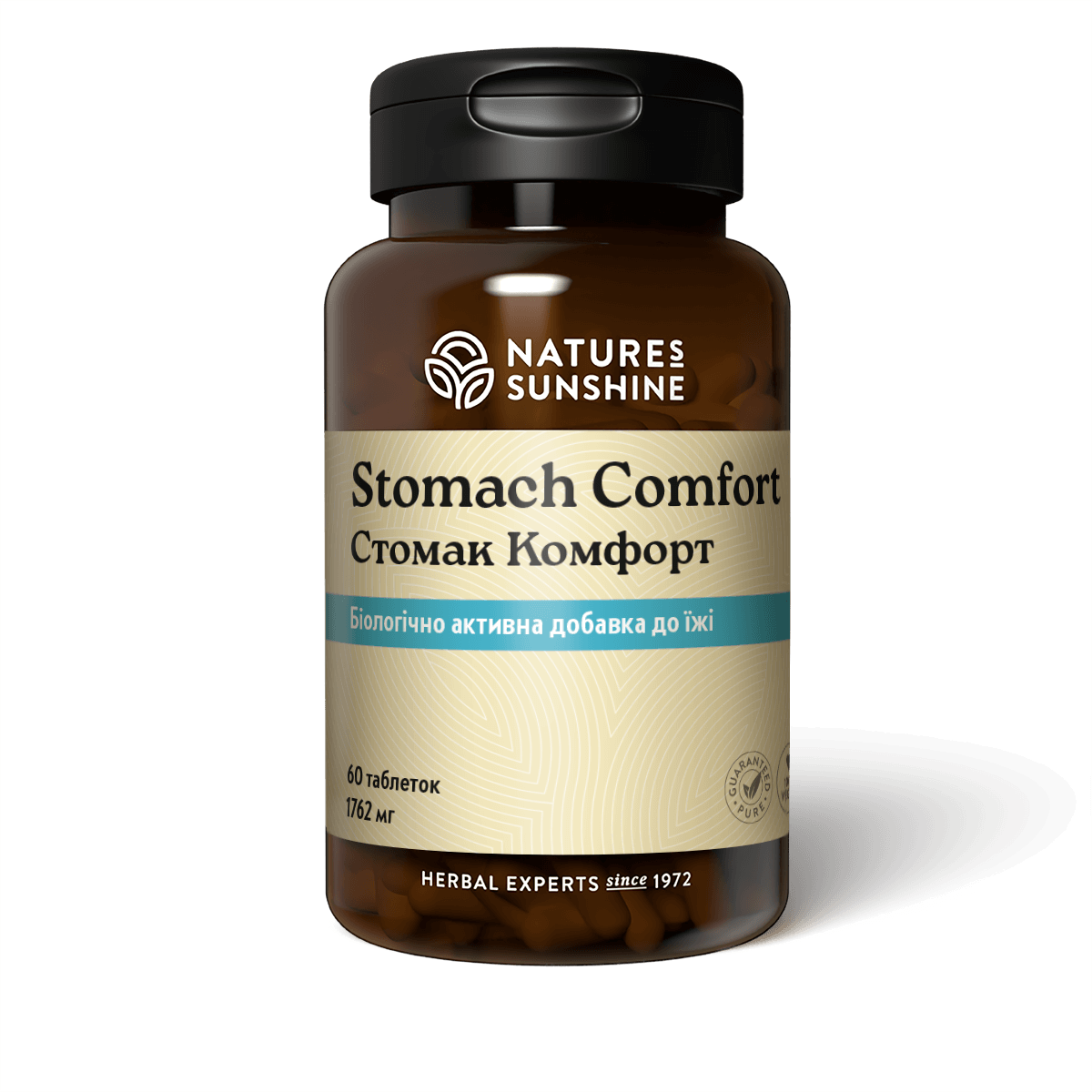 Надмірно висока кислотність шлунку, поліпшуючи травну функцію, може спричинити ушкодження слизової оболонки шлунку та цибулини дванадцятипалої кишки з ризиком розвитку виразкового ураження. Закидання кислого вмісту шлунку в стравохід призводить до ураження нижньої третини стравоходу з розвитком гастроезофагеальної рефлюксної хвороби (ГЕРХ) і виникнення печії. Одним зі способів боротьби з клінічними наслідками підвищеної кислотності шлунку є призначення лікарських засобів, які обволікають слизову оболонку стравоходу та шлунку, зв’язують та частково нейтралізують соляну кислоту та пепсин. Стомак Комфорт (англ. комфорт шлунку) — комплексний продукт, що містить рослинні волокна водоростей (альгінові кислоти), гуарову камедь, ізомальто-олігосахариди, карбонат кальцію, корені в’яза, імбиру та солодки, плоди папаї. Стомак Комфорт (комфорт шлунку) усуває диспептичні симптоми з боку шлунку (біль, кисла відрижка, печія), пов’язані з його підвищеною секреторною функцією. Нейтралізує та зв’язує соляну кислоту, обволікає та захищає слизову оболонку стравоходу, шлунку та дванадцятипалої кишки. Має протизапальну, антисептичну та ранозагоювальну дію, стимулює секрецію слизу. Нормалізує функцію травлення шлунка, усуває дискомфорт під час їди. Не рекомендується особам зі зниженою секрецією соляної кислоти.